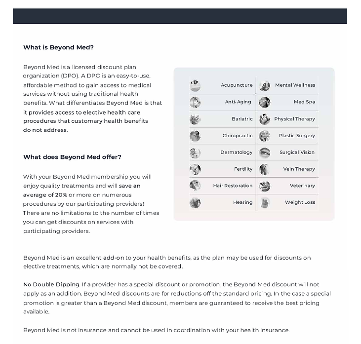 Elevate your health and well-being with access to a proprietary network of board-certified doctors and licensed providers at reduced rates on elective services.